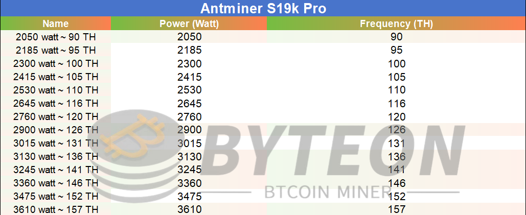 S19k Pro series overclocking & downclocking data reference